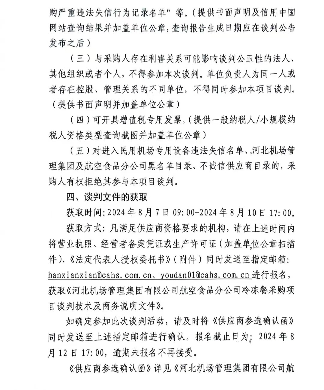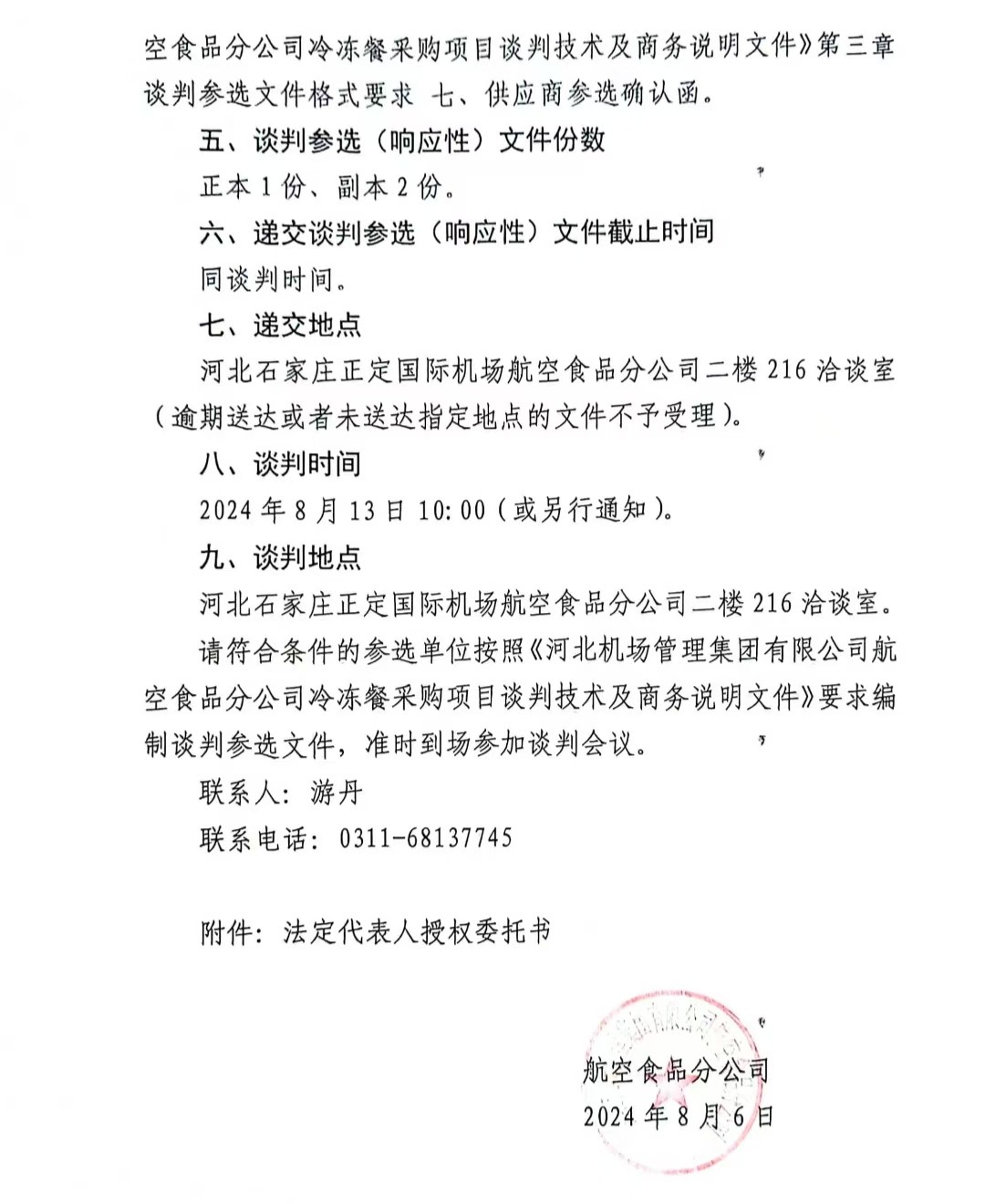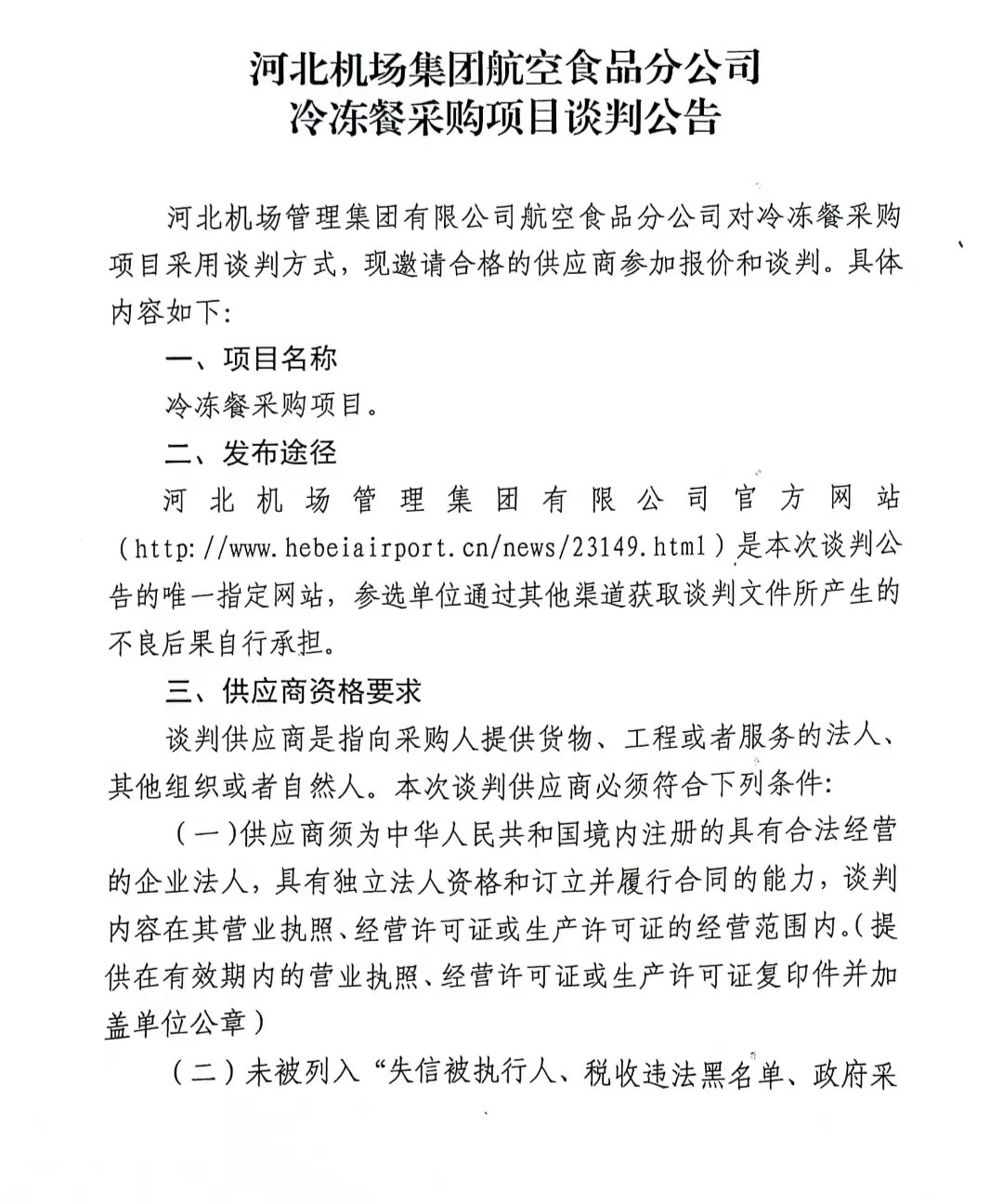 河北機場集團航空食品分公司冷凍餐采購項目談判公告
